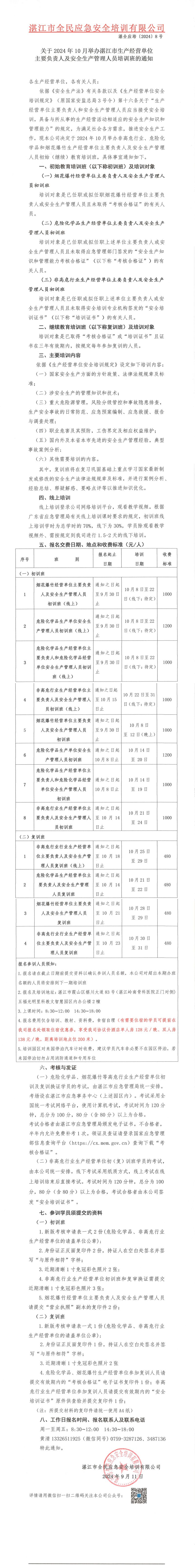 2024年10月湛江市生產(chǎn)經(jīng)營單位主要負責人及安全生產(chǎn)管理人員初始教育培訓班及繼續(xù)教育培訓班的通知