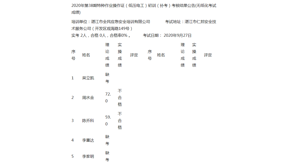 2020年第38期特種作業(yè)操作證(低壓電工)初訓(xùn)(補考)考核結(jié)果公告