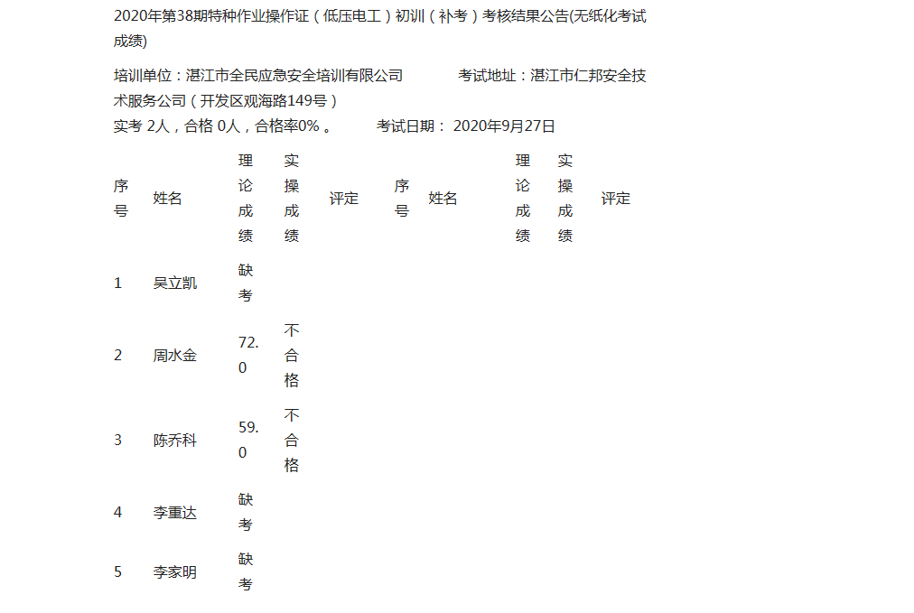 2020年第38期特種作業(yè)操作證(低壓電工)初訓(xùn)(補(bǔ)考)考核結(jié)果公告
