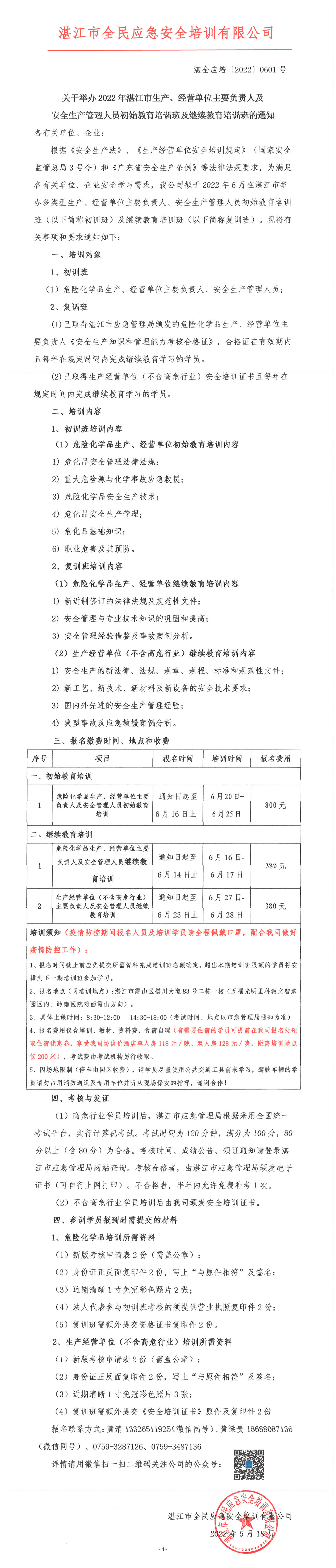 2022年6月湛江市生產、經營單位主要負責人及安全生產管理人員初始教育培訓班及繼續(xù)教育培訓班的通知