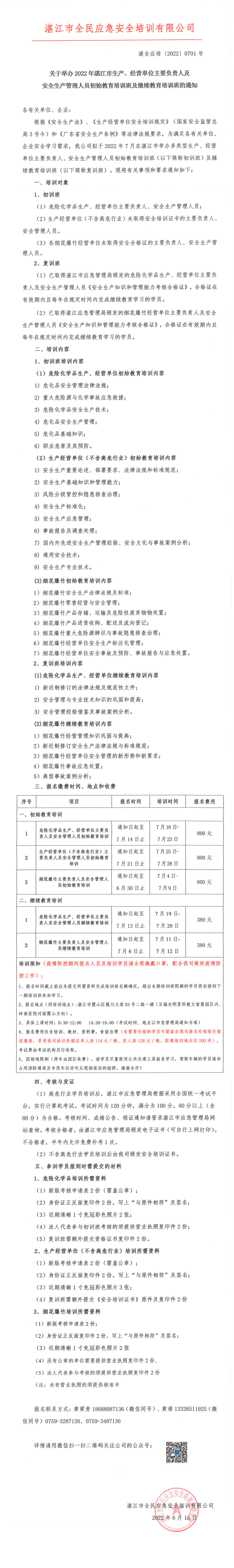 2022年7月湛江市生產(chǎn)、經(jīng)營(yíng)單位主要負(fù)責(zé)人及安全生產(chǎn)管理人員初始教育培訓(xùn)班及繼續(xù)教育培訓(xùn)班的通知
